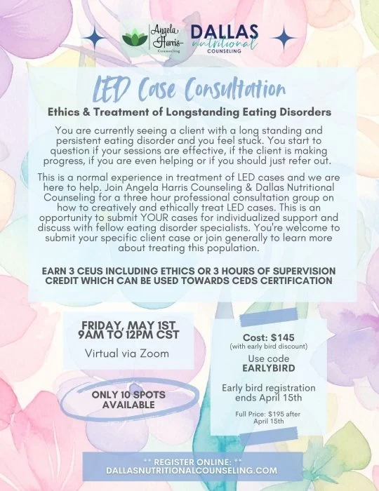 Join Angela Harris Counseling & Dallas Nutritional Counseling for a three hour professional consultation group focused specifically on treating longstanding (formerly known as SEED) eating disorders. Submit your specific client case or join generally to learn more about treating this population. Earn 3 CEUs including 3 hours of supervision.